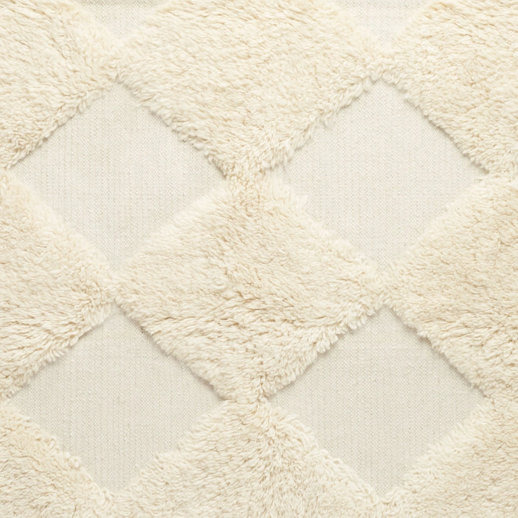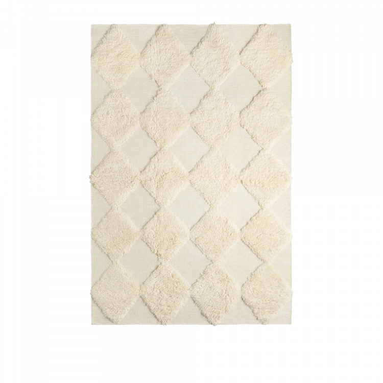 DD Chess Rug Off White är en handspunnen matta från Dusty Deco tillverkad i 100% ull. DD Chess Rug har ett unikt triangelmönster med plattvävda och fluffiga delar. De höga och låga effekterna i mönstret ger mattan ett levande och inbjudande uttryck.