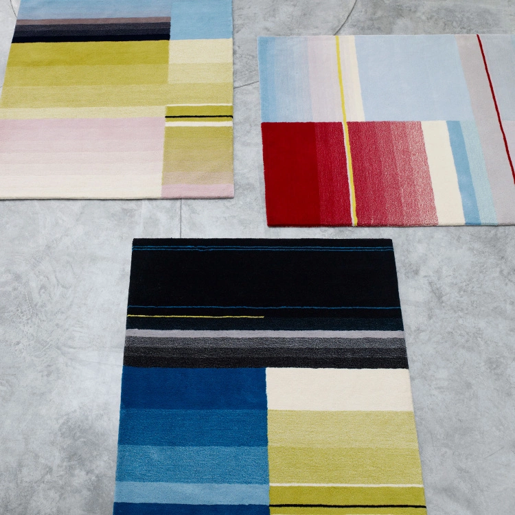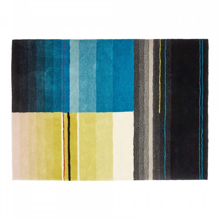 Colour Carpet 01 är en del av kollektionen Colour Carpet, Schotten & Baijings första kollektion mattor för varumärket HAY. Mattorna vävs i 100 % ull från Nya Zeeland vilket innebär en matta av högsta kvalitét. Colour Carpet tillverkas i tre spännande färgställningar där var och en har sin unika identitet med de olika färgblocken. Den här varianten av mattan, Colour Carpet 01, går i mörkare toner. Fälten går från mörkblått till ljusblått, ljusgul till guldgul, bryts av mot ett mindre vitt parti samt ett större i olika nyanser av grått och svart. Smala strimmor av kontrasterande färger skapar adderad effekt.