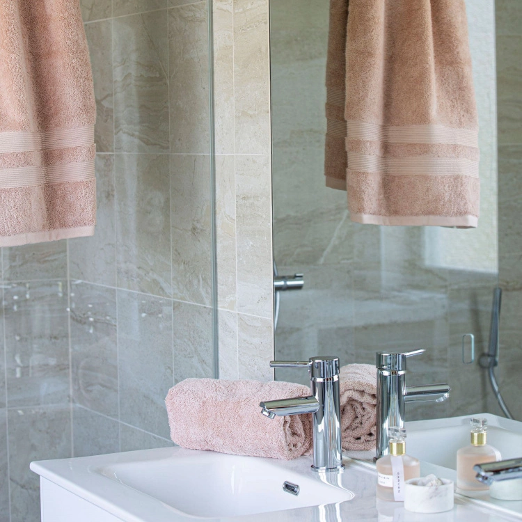 Fontana Handduk EKO Puderrosa är en serie handdukar från Mille Notti. De rosa handdukarna är tillverkade av ringspunnen frotté av kammat bomullsgarn i 100 % ekologisk bomull. Fontana Handduk EKO Puderrosa kommer i fyra olika storlekar. Den största storleken av Fontana Handduk EKO Puderrosa är 100 x 150 cm och försedd med dubbla hängare. Längs med kortsidorna löper en enfärgad bård i samma rosa kulör som resten av handduken. Handdukarna med sin dämpade, rosa färg passar i både det moderna och traditionella hemmet med sin klassiska design.