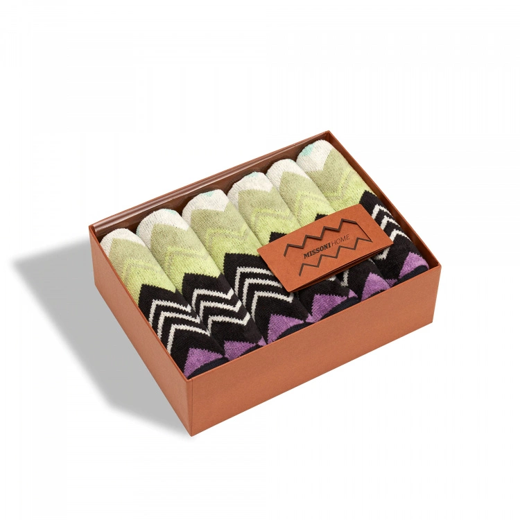 Giacomo är en serie handdukar i lyxig bomullsfrotté från italienska Missoni Home. Denna produkt består av en presentbox innehållandes 6 st små handdukar som mäter 30 x 30 cm. Serien Giacomo T59 har Missonis zig-zagmönster i jordnära nyanser med inslag av gröna och röda toner. Presentboxen är en bra present att ge bort eller att praktiskt använda i sitt eget hem för ansikte, händer eller som en lyxig gästhandduk. Komplettera gärna med Badrumsmatta och Giacomo Badrock i samma färg. Hos Nordiska Galleriet finns flera olika färger av Giacomo handdukar att välja på, däribland handduk, badlakan och duschhandduk. Handduken saknar öglor.