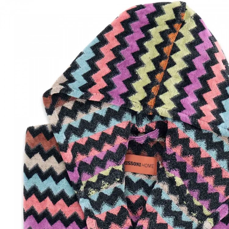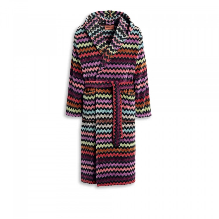 Warner Hooded Bathrobe 159 från det italienska märket Missoni Home, är en mjuk och skön badrock i unisex-variant. Badrocken är gjord av bomull och velour som ger en varm och lyxig känsla såväl på morgon som kväll. Warner Hooded Bathrobe 159 har Missonis klassiska design med ett zick-zack mönster i lila, rosa, gröna och blåa färger som varvas på en svart bakgrund. Badrocken finns även i en variant med blåa och gröna och toner som heter Warner Hooded Bathrobe 170. Ett snöre i midjan gör badrocken enkel att stänga och två stora fickor fram gör att du kan bära med dig väsentliga tillhörigheter såsom din telefon.