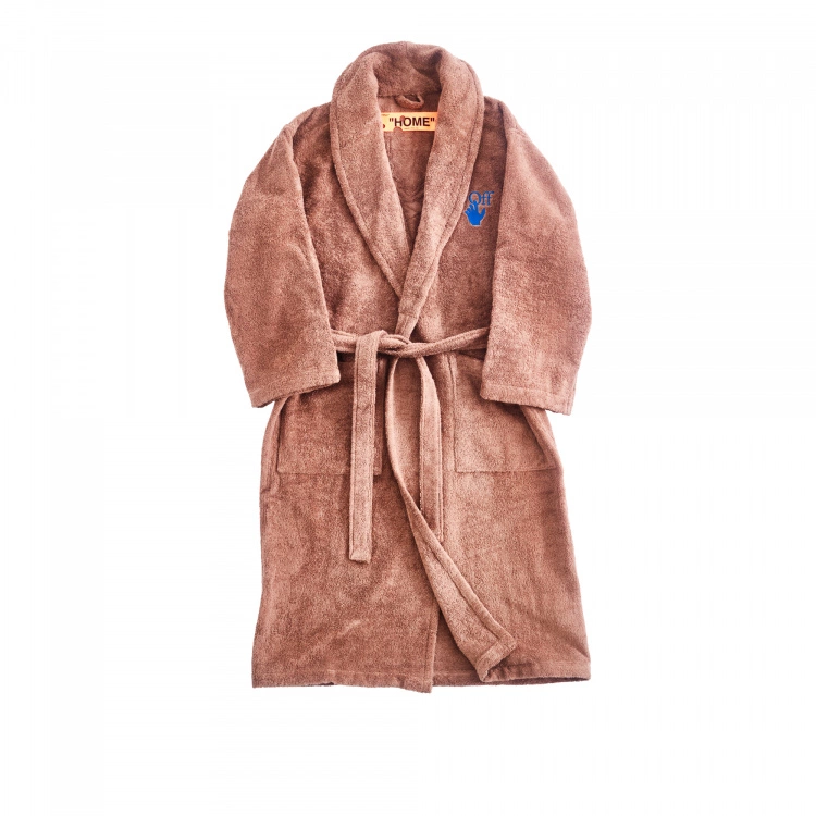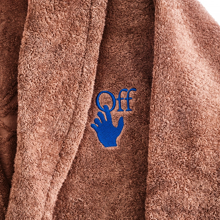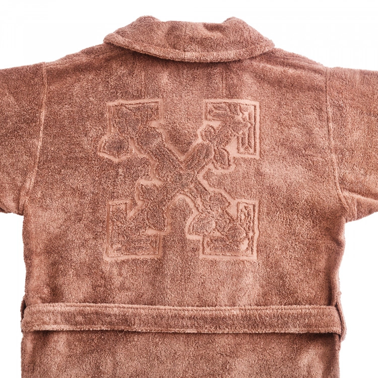Arrow Leaves Bathrobe är en frottébadrock som är designad av Virgil Abloh för det italienska varumärket Off-White. Badrocken är tillverkad i en mjuk bomullsfrotté, har två fickor och kommer med ett justerbart knytband i midjan. De rymliga ärmarna och den omfamnade sjalkragen gör badrocken till ett mysigt plagg att svepa in sig i efter bad eller när du behöver värma dig efter ett utomhusdopp. Ryggen pryds av Off-whites pil-logotyp i samma kulör som resten av badrocken. På framsidan har badrocken Off-whites broderade Swimming Man logotyp i blått.