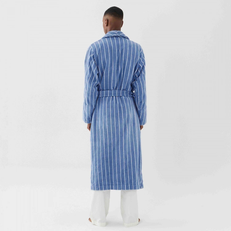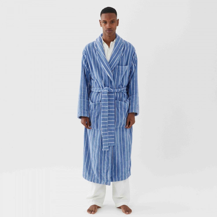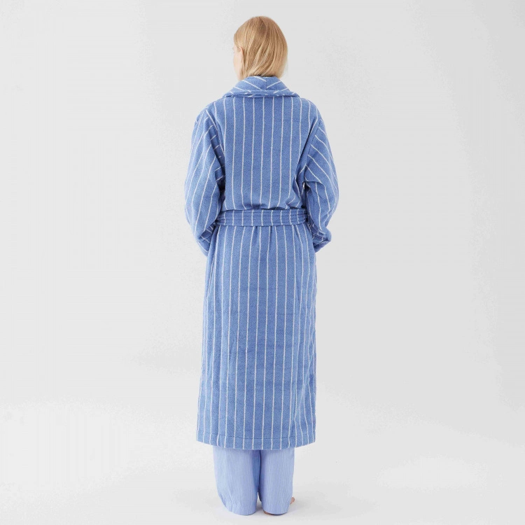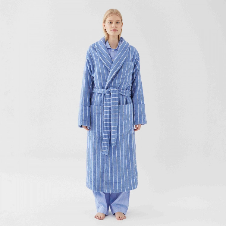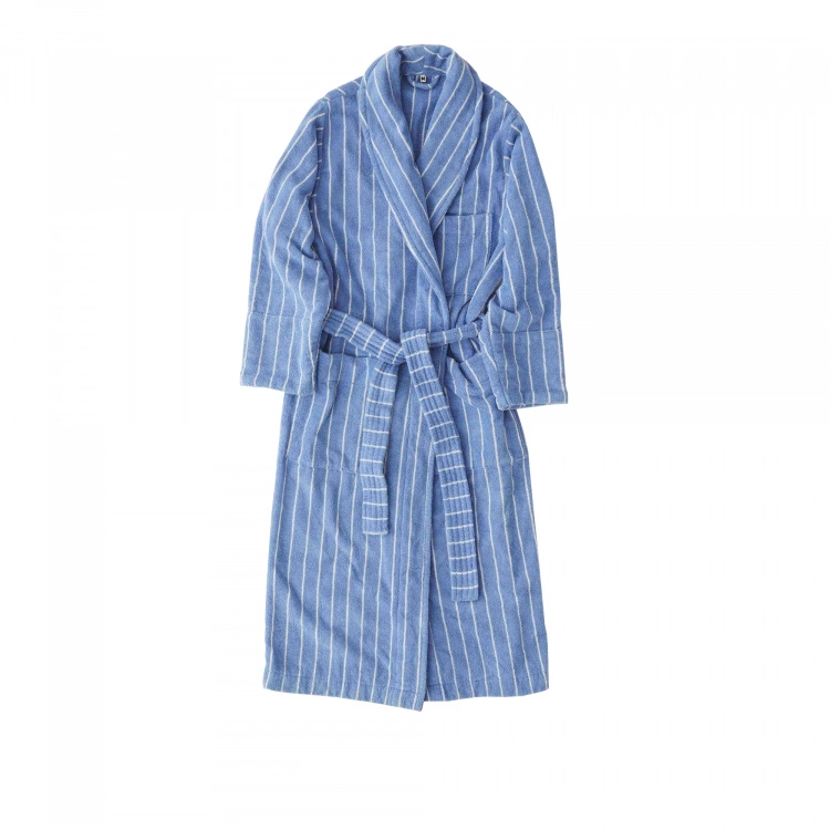 Den randiga badrocken Classic Bathrobe Marseille kommer från danska bäddtextilvarumärket Tekla. Classic Bathrobe Marseille har en tjock, fin kvalitet och en passform som är något oversize för att göra den extra mysig. Classic Bathrobe Marseille är en unisex-modell som passar både kvinnor och män och har en traditionell design. Plagget är vävt i 100 % finkammad, ekologisk bomull som absorberar fukten bra och gör den extra mjuk. Badrocken är designad för att ge optimal komfort både hemma efter duschen och när du behöver värma dig efter ett utomhusdopp.