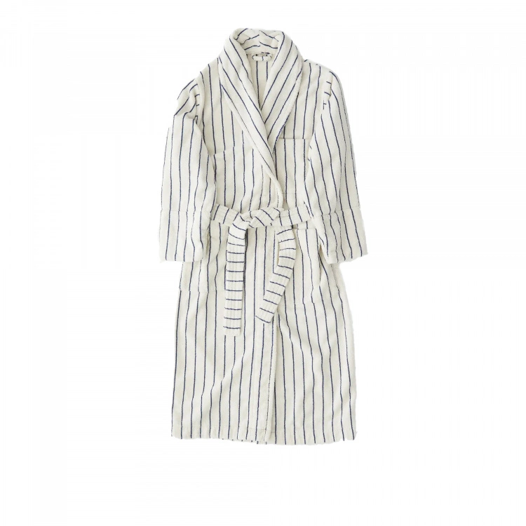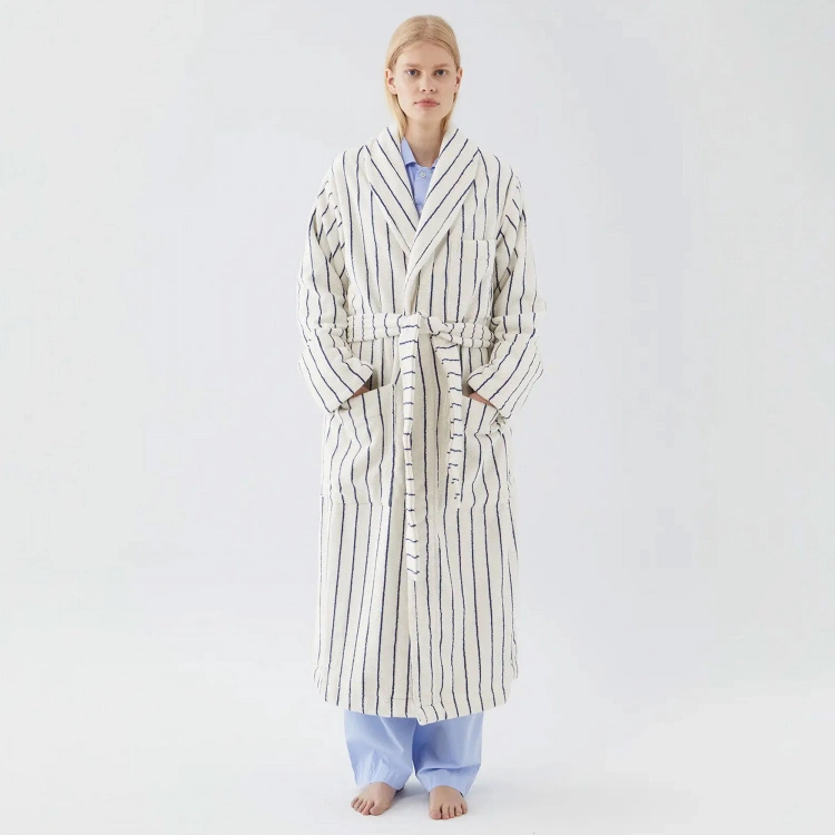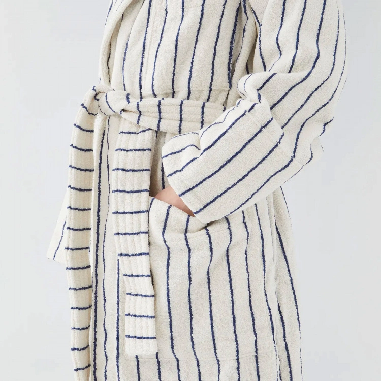 Den randiga badrocken Classic Bathrobe Stripes Carmel kommer från danska bäddtextilvarumärket Tekla. Classic Bathrobe Stripes Carmel har en tjock, fin kvalitet och en passform som är något oversize för att göra den extra mysig. Classic Bathrobe Marseille är en unisex-modell som passar både kvinnor och män och har en traditionell design. Plagget är vävt i 100 % finkammad, ekologisk bomull som absorberar fukten bra och gör den extra mjuk. Badrocken är designad för att ge optimal komfort både hemma efter duschen och när du behöver värma dig efter ett utomhusdopp.