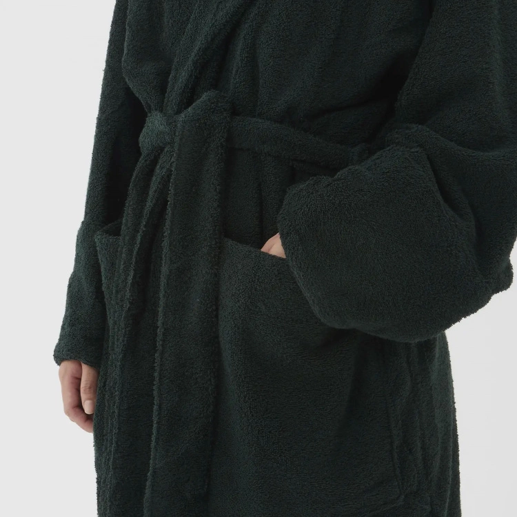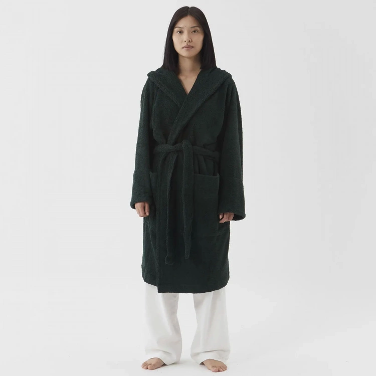 Hooded Bathrobe Forest Green kommer från danska bäddtextilvarumärket Tekla. Badrocken har en tjock, fin kvalitet och en passform som är något oversize för att göra den extra mysig. Hooded Bathrobe Forest Green är en unisex-modell som passar både kvinnor och män och har en traditionell design. Plagget är vävt i 100 % finkammad, ekologisk bomull som absorberar fukten bra och gör den extra mjuk. Badrocken är designad för att ge optimal komfort både hemma efter duschen och när du behöver värma dig efter ett utomhusdopp.
