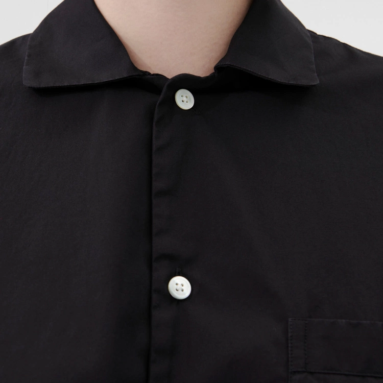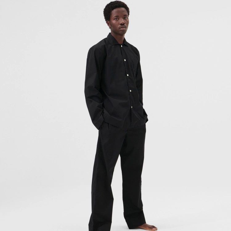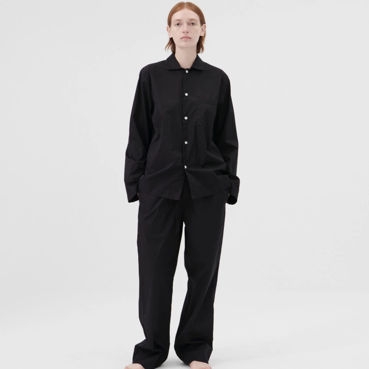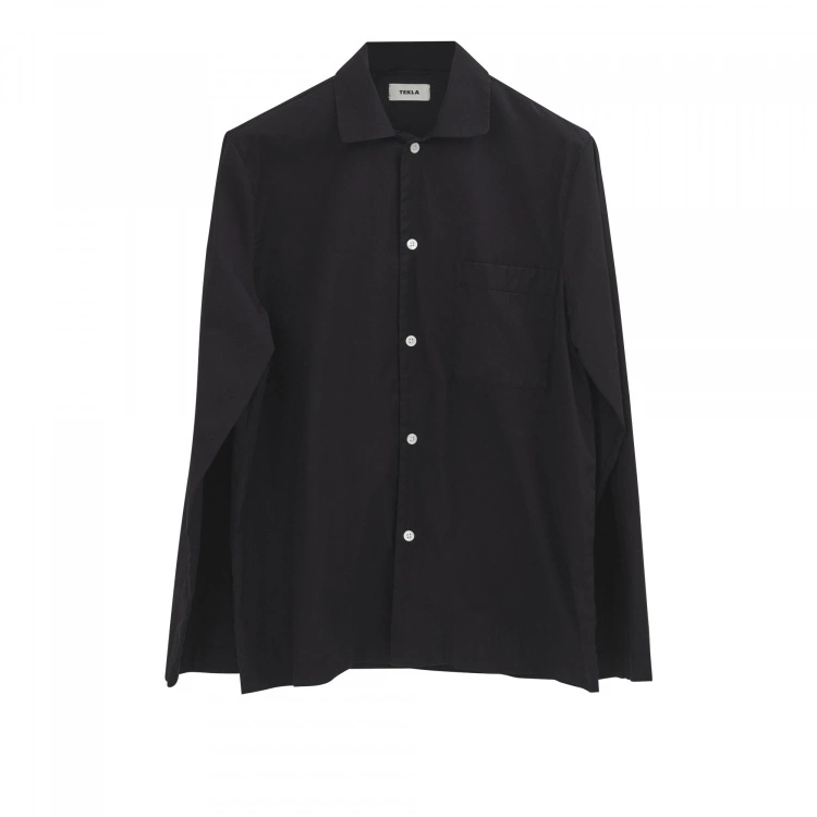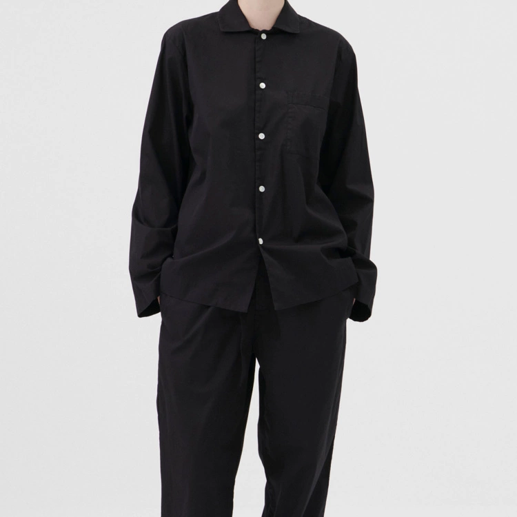 Poplin Pyjamas Shirt All Black är en pyjamasskjorta i en djup svart färg från det danska varumärket Tekla. Pyjamasen är producerad i Portugal och är tillverkad av 100% ekologisk bomull. Den lätta bomullen är Oeko-Tex certifierad och vävd till en poplinkvalitet som ger en krispig och mjuk känsla. Tyget har genomgått en lätt stentvätt för att upplevas extra mjuk mot huden. Pyjamasskjortan är en unisex-modell med en oversize och avslappnad passform. Skjortan är designad med en bröstficka på vänster sida, en rund krage och vackra pärlemorknappar.