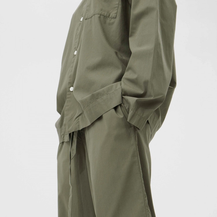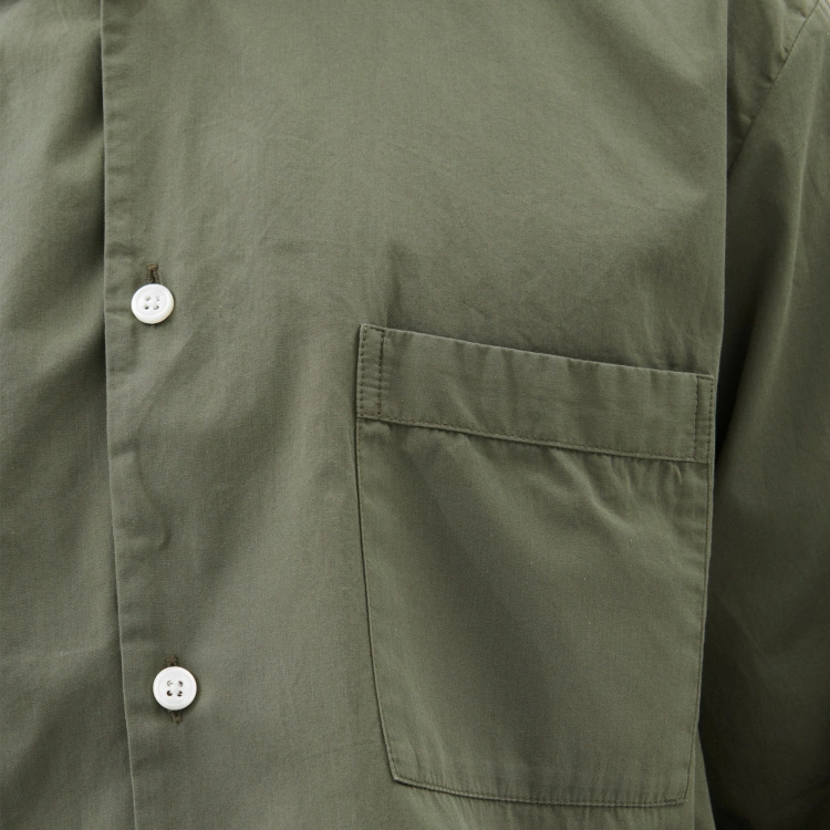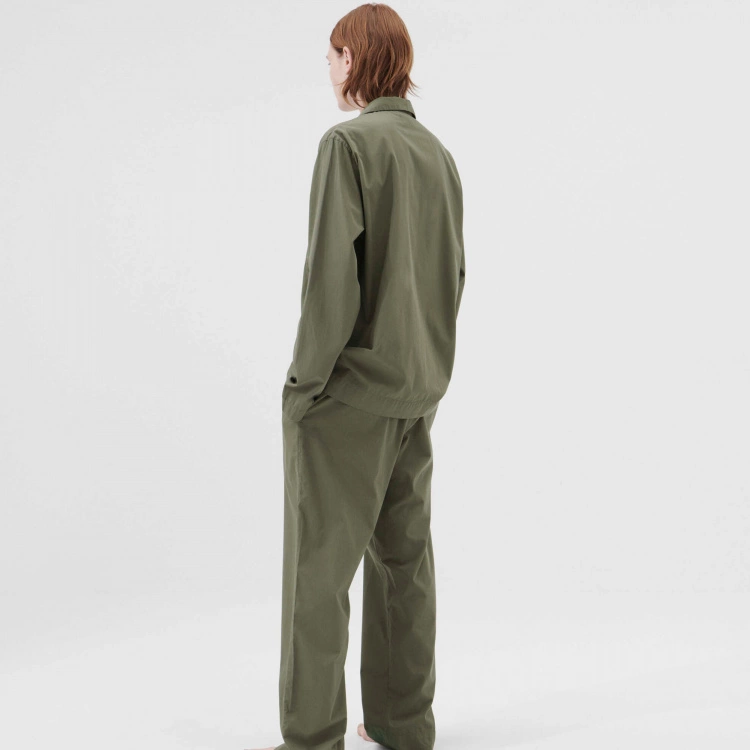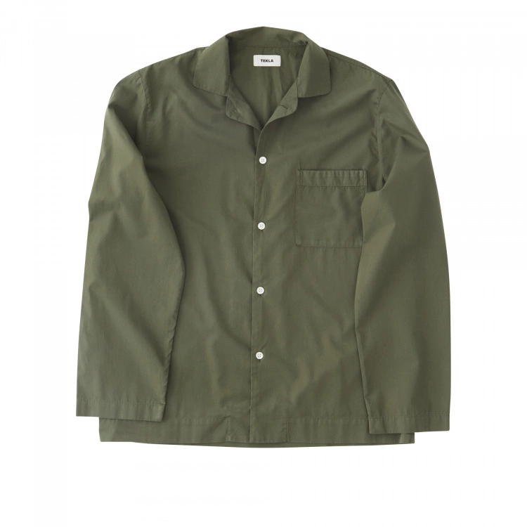 Poplin Pyjamas Shirt Willow är en pyjamasskjorta i en vacker olivgrön färg från det danska varumärket Tekla. Pyjamasen är producerad i Portugal och är tillverkad av 100% ekologisk bomull. Den lätta bomullen är Oeko-Tex certifierad och vävd till en poplinkvalitet som ger en krispig och mjuk känsla. Tyget har genomgått en lätt stentvätt för att upplevas extra mjuk mot huden. Skjortan är en unisex-modell med en avslappnad och lite oversize passform. Skjortan har en bröstficka på vänster sida, en rund krage och vackra pärlemorknappar.