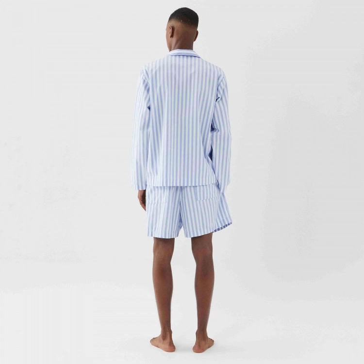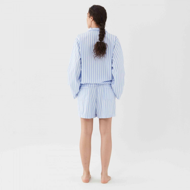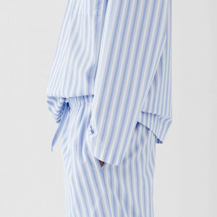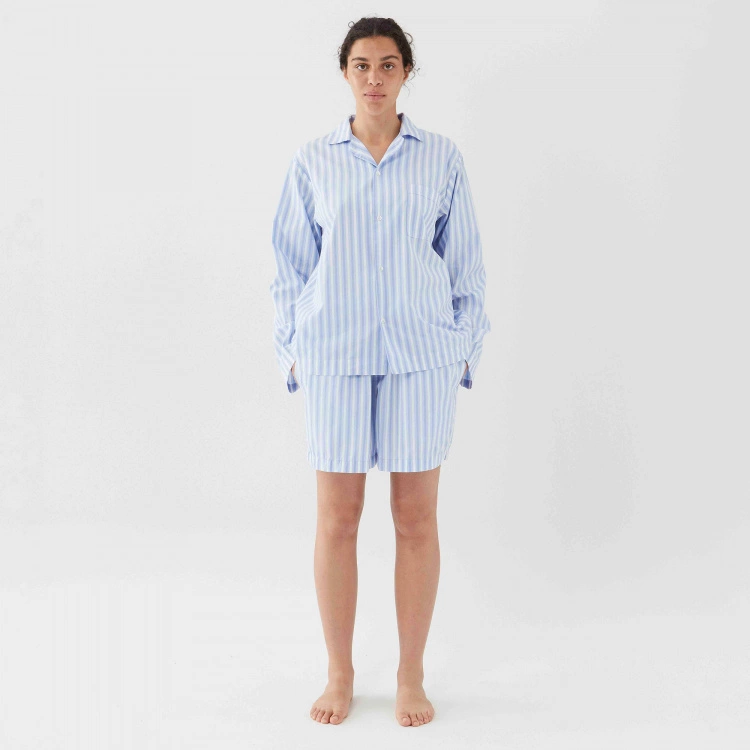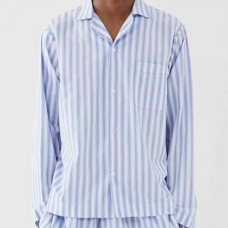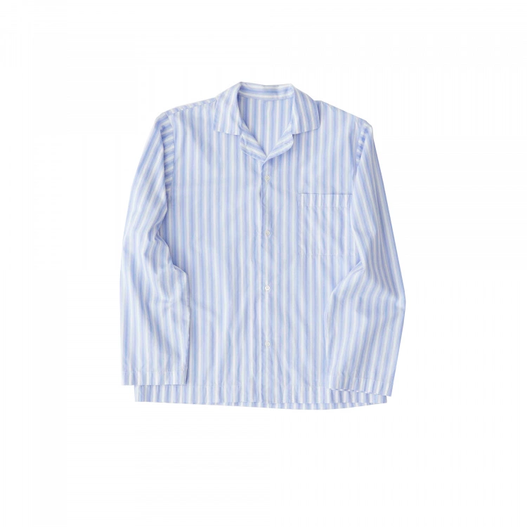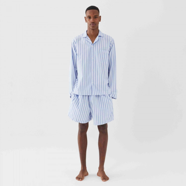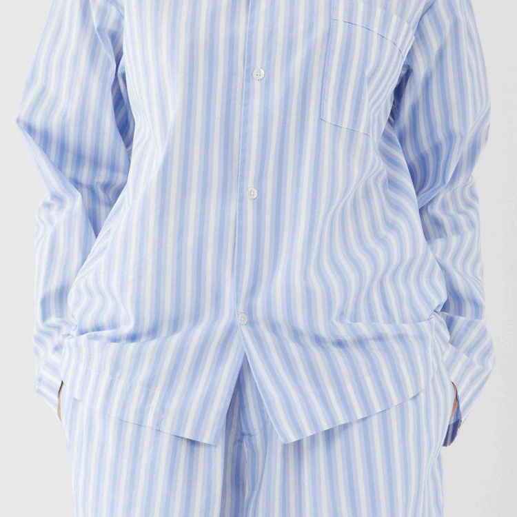 Pyjamasskjortan Poplin Sleepwear Shirt Fading Blue är ett elegant sovplagg från danska varumärket Tekla. Skjortan är av poplinkvalitet som ger en krispig och mjuk känsla som även förstärkts genom att stentvättats. Materialet är 100 % ekologisk bomull som är Oeko-Tex certifierad. Poplin Sleepwear Shirt Fading Blue är i unisex-modell som passar både män och kvinnor med en passform som är något oversize och avslappnad. Skjortan i blå och vitrandig design med klassisk skjortknäppning kan kombineras med shortsen i samma design.