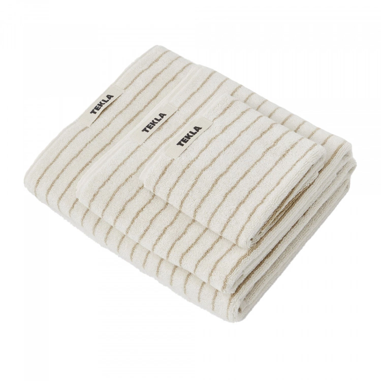 Terry Towel Sienna Stripes är handdukar från det danska varumärket Tekla. Handdukarna är tillverkade av 100 % organisk samt Oeko-Tex-certifierad bomull, som har kammats för att bli starkare, mjukare och jämnare än klassiska bomullsfibrer. Handdukarna är även fria från skadliga kemikalier. Terry Towel Sienna Stripes är vävda i en extra tjock 600 g frotté som gör dom både hållbara och absorberande. Handdukarna finns i ett flertal olika storlekar att välja mellan. Tekla erbjuder handdukar i en mängd olika färger, både enfärgade och randiga.
